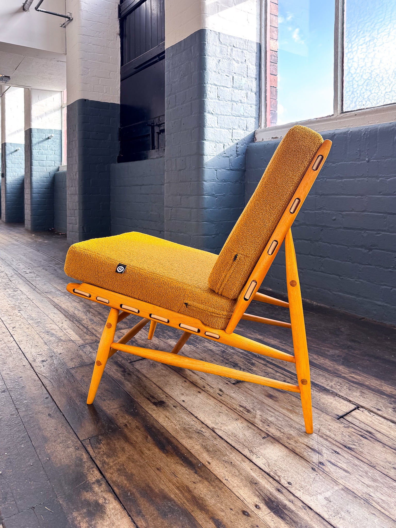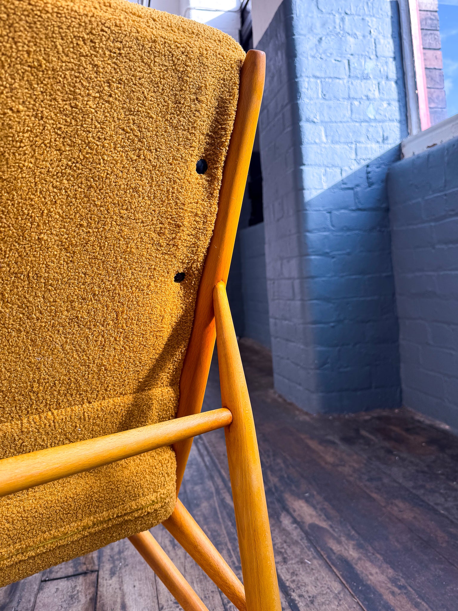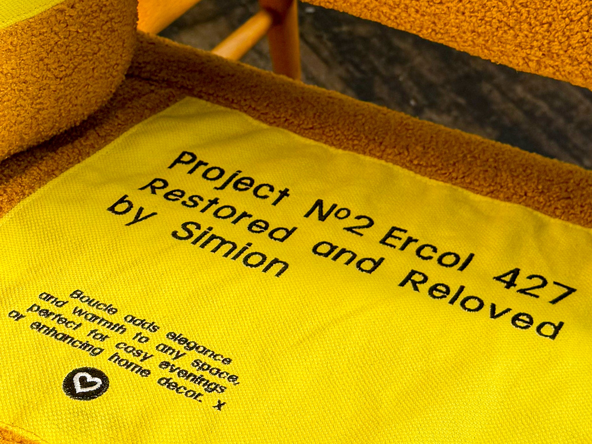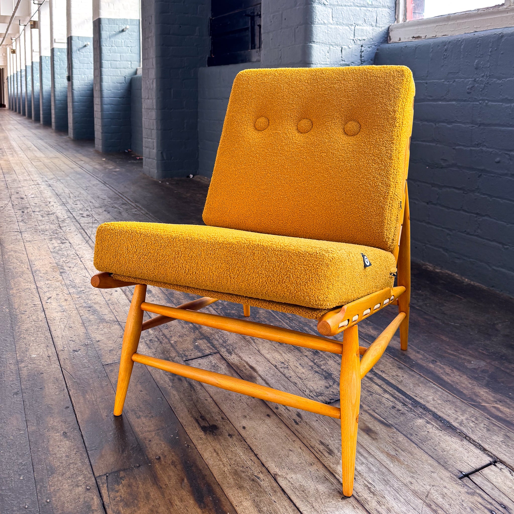 The frame has been expertly restored in my Manchester studio and finished with VOC-free linseed oil in Citrine, bringing out the natural glow of the elm and beech. The seat is rebuilt with eco-conscious padding made from recycled plastic bottles and upholstered in a rich mustard boucle fabric. The boucle adds elegance and warmth to any space – perfect for cosy evenings or enhancing your home décor.